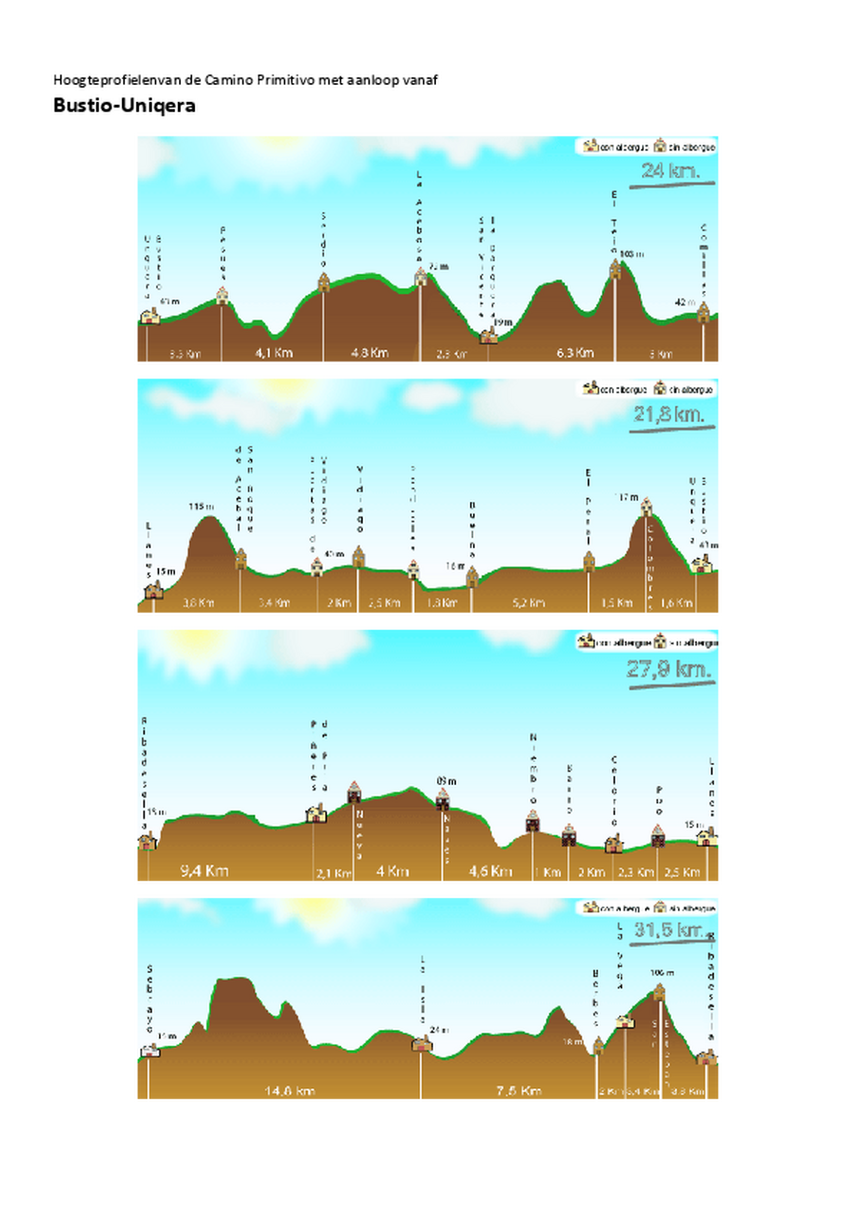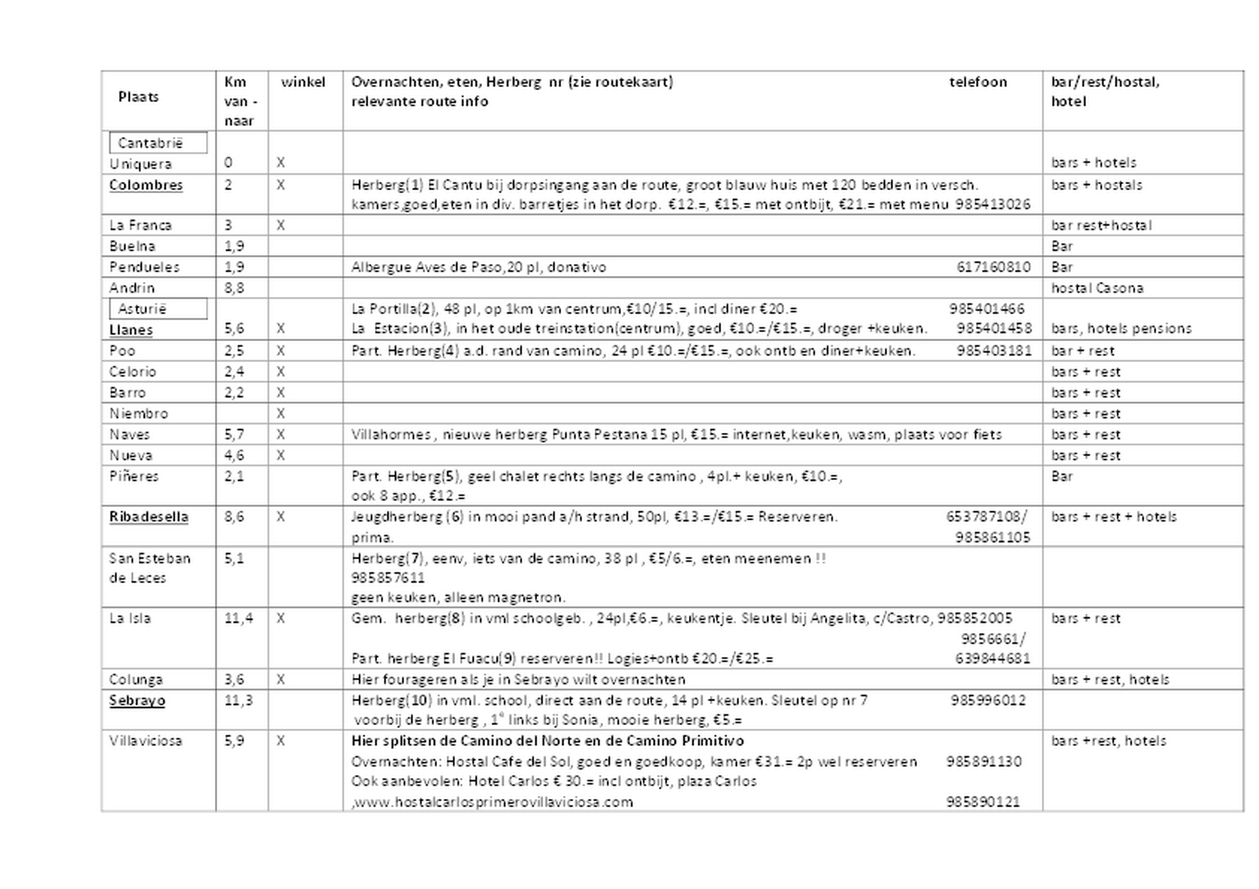 Vervolgens vindt U een lijst met alle overnachtingsadressen langs de Camino Primitivo, waarbij de dikgedrukte namen de plaatsen aangeven waar ikzelf heb overnacht. Tevens vindt U er een lijst met de hoogteprofielen van de diverse etappes. De herbergen staan met een symbool op de kaart aangegeven en hebben een nummer dat correspondeert met een zeer uitgebreide lijst met overnachtingsadressen ,de beste herbergen zijn in rood aangegeven . Door regelmatig kleine oplages te maken van de gids is deze altijd up-to-date!